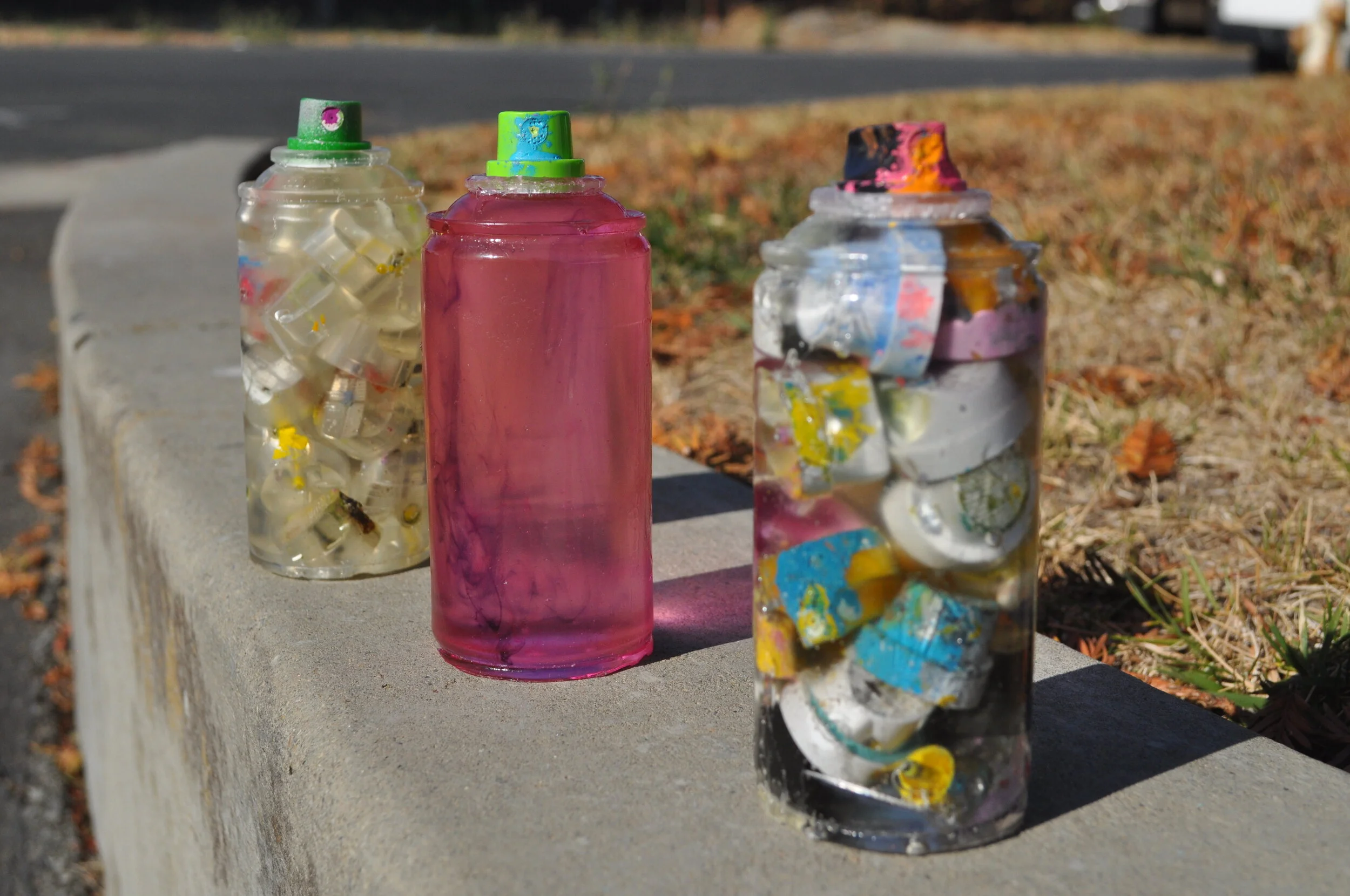 These are my resin spraycans, I use clogged caps and epoxy. All my caps come from artists all over the world, in an effort to recycle the caps, and minimize artistic waste, I try and put them to use and make functional art.